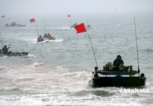 八月二十四日,“和平使命—2005”中俄聯合軍事演習第三階段兩棲登陸作戰實兵演練在山東半島展開,參加兩棲登陸作戰實兵演練的中國海軍陸戰隊水陸坦克向岸邊突擊。作者:王麗南