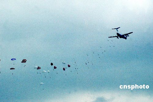 八月二十四日,“和平使命—2005”中俄聯合軍事演習第三階段兩棲登陸作戰實兵演練在山東半島展開。圖為參加兩棲登陸作戰實兵演練的中國空降兵在演練戰區實施跳傘。作者:王麗南
