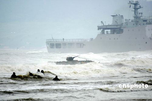 八月二十四日,“和平使命—2005”中俄聯合軍事演習兩棲登陸作戰實兵演練在山東半島如期進行。由于浪高風急,一輛俄裝甲運兵車上的陸戰隊員被沖出車外,正向岸邊移動。作者:王麗南