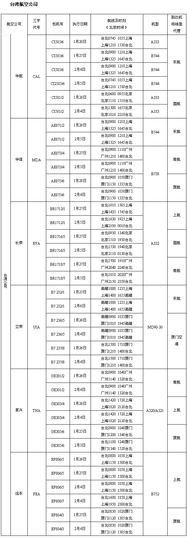 中新網1月10日電 來自中國臺灣網的消息,今年兩岸春節包機航班已經正式確定。其中,臺灣將由華航、長榮、華信、立榮、復興及遠東六家航空公司執行航務;大陸方面則由中國國際航空股份有限公司、東方航空股份有限公司、南方航空股份有限公司、上海航空股份有限公司、廈門航空有限公司、海南航空股份有限公司執行飛行任務。