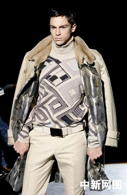 1月16日,在意大利米蘭舉行的2006/07秋冬男裝發布會上,一名模特在展示意大利設計師Gianfranco Ferre的作品。