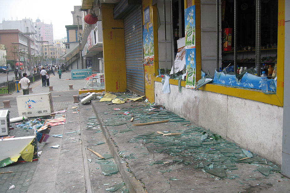 7月6日,烏魯木齊市被犯罪分子洗劫的一家商店。在5日晚發生的嚴重暴力犯罪事件中,已造成140人死亡,800多人受傷;被毀車輛達260部;受損門面房203間,民房14間,總過火面積達到56850平方米,全市共有220多處縱火點,有兩棟樓房被燒毀。中新社發 鐘新 攝