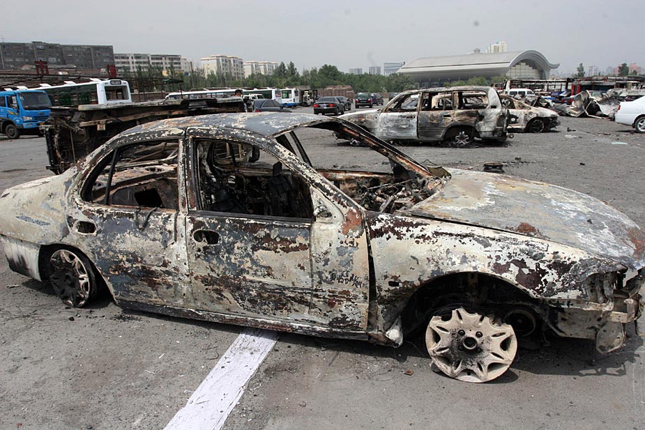 7月6日,烏魯木齊街頭被犯罪分子焚毀的汽車慘不忍睹。在5日晚發生的嚴重暴力犯罪事件中,已造成140人死亡,800多人受傷;被毀車輛達260部;受損門面房203間,民房14間,總過火面積達到56850平方米,全市共有220多處縱火點,有兩棟樓房被燒毀。中新社發 夏春平 攝