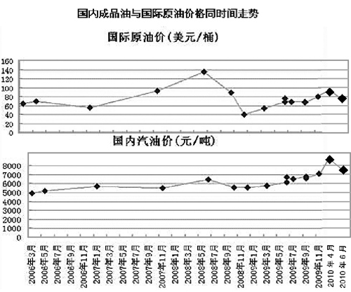 記者查資料發現,2008年6月20日國際油價為每桶132美元,目前為80美元,與此同時,我國的油價卻每噸上漲了1710元。