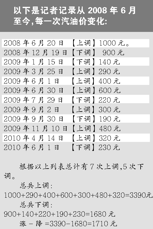 在帖子里,網友列出了從2008年6月至2010年6月,每一次國家發改委對油價的調整,得出結論是漲7次,降4次,每噸汽油的漲幅總額為3390元,而每噸汽油的降幅總額為760元,于是得出計算結論:2年前的油價是74美元,現在還是74美元,可是汽油價卻漲了2630元1噸。