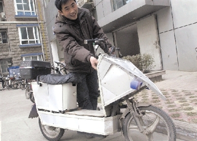 2007年買(mǎi)的電動(dòng)車(chē)沒(méi)跑多久,車(chē)身上就擦碰得不成樣子。看著車(chē)上磕磕碰碰留下的痕跡,小郭就利用自己做裝修的技術(shù),把平時(shí)生意上用剩下的邊角料按照車(chē)身的大小組裝了一個(gè)外殼,然后又用家裝廚衛(wèi)等使用的鋁扣板用鉚釘固定上去。此外,還加裝了照明燈和喇叭。電動(dòng)車(chē)改裝四五個(gè)月來(lái),每每走在街上,都引來(lái)眾人好奇的目光。