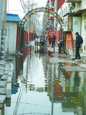 據(jù)居民介紹,西馬場(chǎng)北里只有這一條東西走向的胡同,居民出門(mén)、購(gòu)物都必須走這條路。可現(xiàn)在路面每天汩汩往外冒臭水,人們只好用方磚沿著胡同北面鋪了一條窄路勉強(qiáng)通行,而現(xiàn)在那些方磚也被臭水淹沒(méi)了,居民通行更加困難。
