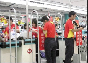 昨天上午9點半左右,在白石橋方圓店,家樂福店員們穿著紅黃兩色的新裝,胸前印著國旗,有的帽子上印著“beijing2008”字樣,有的印著五環和中國印等標識。記者隨后又來到家樂福中關村店和國展店,兩店的員工也大多身著新裝頭戴新帽。國展店一位女店員說,4月26日,店里給員工發了新的員工裝,據說成本是帽子80元、上裝近200元。