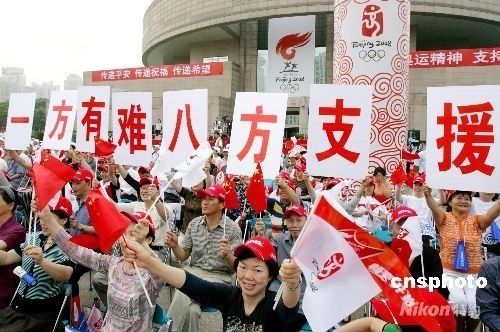 5月23日,北京奧運圣火在上海開始傳遞。上海市民在喜迎奧運圣火的同時,更心系著四川地震災區人民,在火炬傳遞沿途高舉“一方有難,八方支援”、“團結一致,眾志成城”等橫幅,表達和四川地震災區民眾共度難關的決心。 中新社發 湯彥俊 攝
