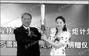 昨天上午,蛙泳皇后羅雪娟將北京奧運(yùn)會(huì)第一棒火炬捐贈(zèng)給中華思源工程扶貧基金會(huì),并正式出任該基金會(huì)“愛心火炬計(jì)劃”形象大使。