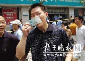 “我實(shí)在太困了,還好拿到了第一鈔!趕快回家吃吃喝喝上床睡覺。”上午9點(diǎn)40分,華夏銀行門口,排在“NO.1”、家住三牌樓的市民王強(qiáng)興奮地拿著奧運(yùn)紀(jì)念鈔沖出人堆,歪歪斜斜地推出電動(dòng)車,恍恍惚惚地騎車回家,并不時(shí)小心護(hù)著屁股下面的藏著“奧運(yùn)鈔”的車座。王強(qiáng)疲憊地告訴記者,前天下午3點(diǎn)多,他就帶著席子趕來銀行門口排隊(duì),始終排在第1位,終于在銀行開門兌鈔時(shí)拿到了“第一鈔”。從前天下午3點(diǎn)多到拿到紀(jì)念鈔,他花了整整18個(gè)小時(shí)。為了穩(wěn)坐排隊(duì)者的“頭把交椅”,他粒米未進(jìn)、滴水未喝,雖帶著席子,卻覺也沒敢睡。