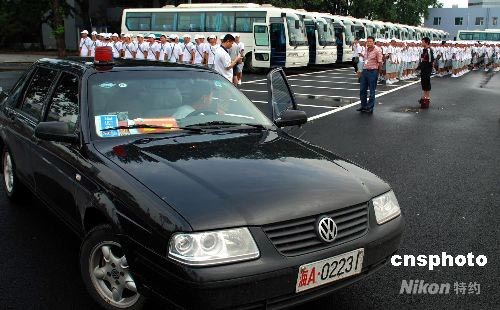 7月15日早上,除一輛懸掛海軍牌照的開路轎車外,其它進入鳥巢的車輛均摘掉了車牌。北京奧組委采取嚴格的保密措施防止開幕式節目內容泄露。中新社發 楊慧峰 攝