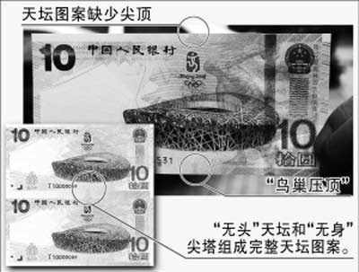 “奧運紀念鈔出現(xiàn)錯誤,很可能是錯幣!”——繼遭到發(fā)行量過小、發(fā)行方式倉促不透明的指責后,奧運紀念鈔近日又引發(fā)爭議。市民和錢幣收藏專家推測,印刷或設計過程中可能有失誤,導致錢幣正面的天壇圖案缺少尖頂,而殘缺的這部分卻在“鳥巢”下方現(xiàn)身,十分蹊蹺。由于央行對此至今尚無回應,大家眾說紛紜。