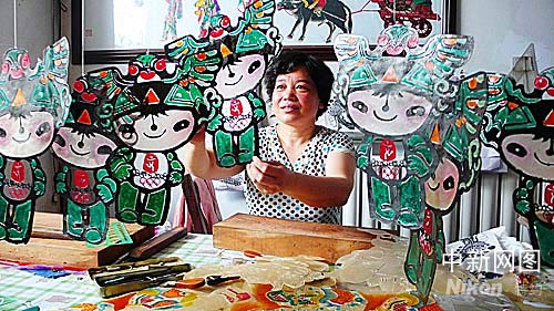 “山西省民間藝術大師”趙翠蓮雕刻出奧運福娃系列皮影,表達了山西人對奧運的期盼和祝福。 馮文芳 攝