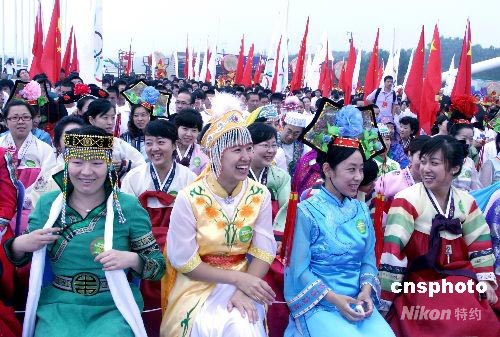 7月17日,北京奧運火炬在沈陽傳遞,當地少數民族群眾喜迎奧運火炬。中新社發 周兆軍 攝