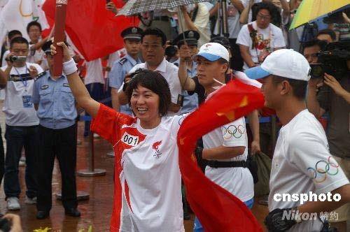 7月19日上午8時,北京奧運火炬在大連傳遞,傳遞路線從大連經濟技術開發區發現王國主題公園開始,到經濟技術開發區中華武館結束,全長9.41公里。大連市共有火炬手208名,圖為中國第一個歐文斯獎獲得者、奧運冠軍王軍霞傳遞第一棒火炬。 中新社發 宋太盛 攝
