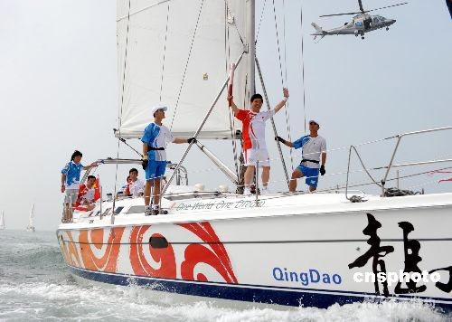 圖:奧運(yùn)火炬在奧運(yùn)帆船賽場(chǎng)傳遞