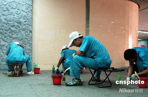 7月23日,一批年輕的清潔工在天安門廣場一側的地下通道中,清理游客在地面上留下的口香糖遺留物。中新社發 張雙雙 攝