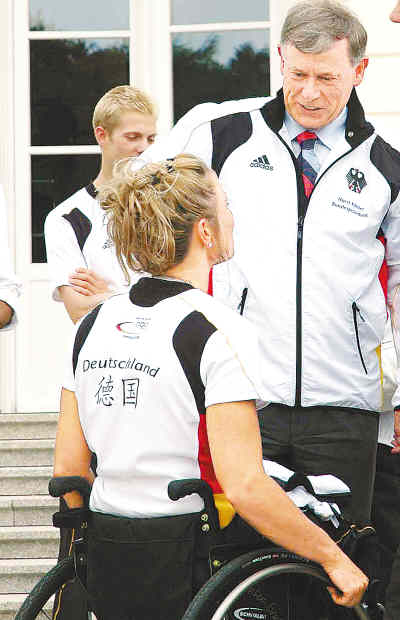 德國總統(tǒng)克勒與殘疾人運(yùn)動(dòng)員親切交談。