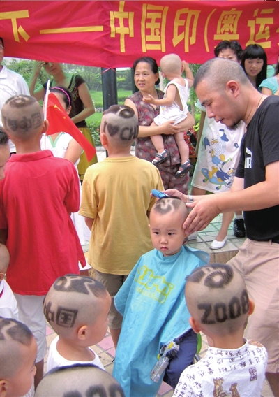 昨天,吳大勝(右一)正在一名小朋友頭上“創作”。北京市民吳大勝這幾天忙著免費為小區的孩子理“奧運頭”,以迎接第29屆奧運會。他在孩子們的頭上理出多種圖案,受到歡迎。