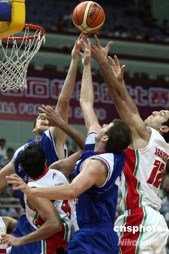 7月30日,正在江蘇南京進行的國際籃聯2008鉆石杯男籃第二日比賽,伊朗隊72比70險勝塞爾維亞隊(藍)。圖為雙方在籃下激烈拼搶。中新社發 盛佳鵬 攝