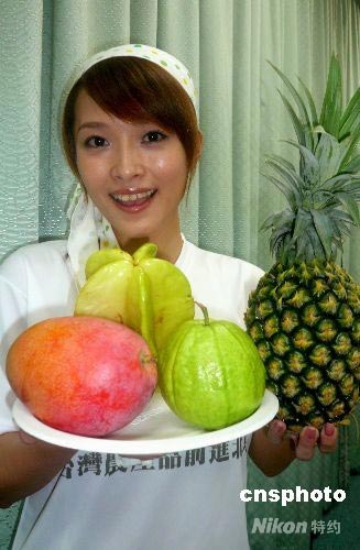 獲選奧運推薦水果的臺灣鳳梨(菠蘿)、楊桃、芭樂(番石榴)、芒果共計10噸,正由島內陸續運往北京專供奧運村。圖為記者會上,女主持人托著被形容為F4的這四種水果供記者拍照。中新社發 董會峰 攝