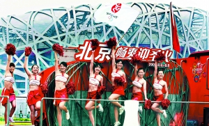 今天清晨6點,奧運會火炬北京傳遞的第一輛花車在鳥巢前亮相。 安旭東攝