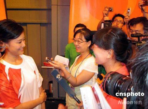 八月四日,奧運火炬北京段傳遞路線和部分火炬手名單公布。中國知名歌唱家宋祖英在首場新聞發布會上亮相,宣布將擔任火炬手。宋祖英將出現在八月七日北京地壇火炬傳遞活動現場。在此之前的火炬傳遞活動中,較少出現火炬手提前曝光、與媒體會面的情形。中新社發 許曉青 攝