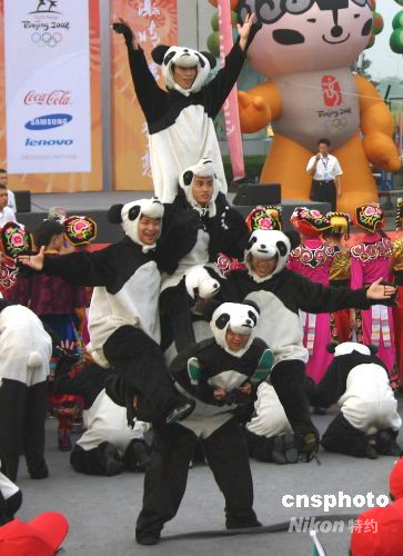 8月5日上午,奧運火炬在成都傳遞,多才多藝的成都人在火炬傳遞起點“成都出口加工園”舉行了精彩的文藝表演。圖為裝扮成大熊貓的雜技演員在表演。中新社發 黃永莉 攝