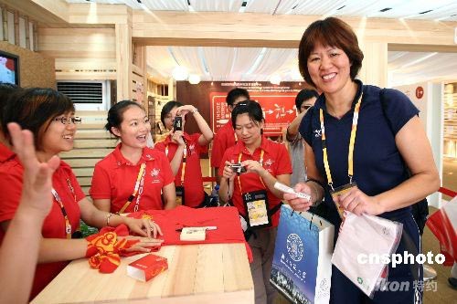 8月5日,美國女排主教練郎平在北京奧運村紀念章交換中心內領取了一件環保T恤衫和環保筷子。每件T恤衫是用從5個500毫升裝的塑料可樂瓶中提取的纖維,再補充一些棉纖維做成的。 中新社發 盛佳鵬 攝