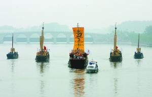 昨日,火炬在京杭大運河通州段用仿古船傳遞。本報記者 浦峰 攝