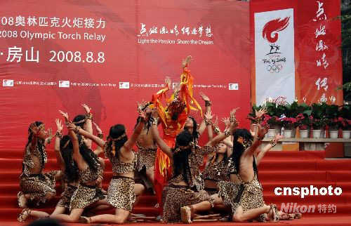 8月8日清晨,第29屆夏季奧運會火炬,從周口店遺址出發,開啟最后一天的傳遞。圖為扮演遠古時代北京人的男女演員以“原生態”的舞蹈歡迎奧運火炬。中新社發 王東明 攝