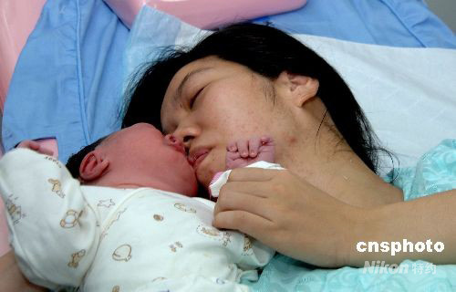 8月8日清晨5點30分,福州市民范敬琴在福建省第二人民醫院婦產科手術室順利產下一名奧運男寶寶。圖為范敬琴親吻喜降人間的奧運寶寶。中新社發 劉可耕 攝