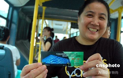 8月8日,北京奧運會開幕日,北京公交集團公司在所屬線路車上發售奧運會開幕紀念公交車票。據了解,奧運公交紀念車票分四種票樣,在不同線路車上發售,因數量有限,紀念票售完后仍出售現行普通票。圖為乘客高興地展示買到的奧運紀念車票。中新社發 張雙雙 攝
