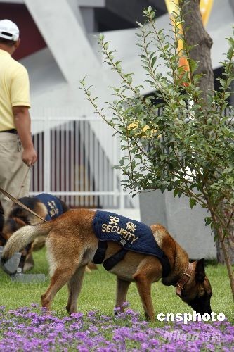 圖為搜爆犬在“鳥巢”周邊搜爆。中新社發 杜洋 攝