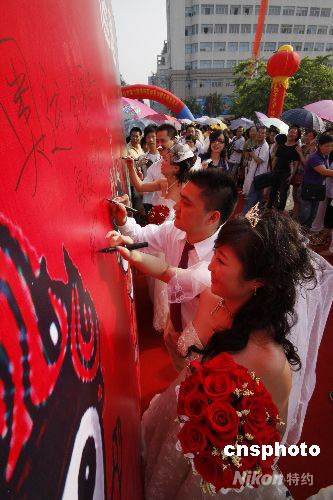 2008年8月8日,18對新人齊聚瑞安市的廣場參加集體婚禮。另外還有10對鉆石婚、金婚夫婦到場,28對愛侶在現場近千名群眾的祝福聲中互換信物。 中新社發 孫凜 攝