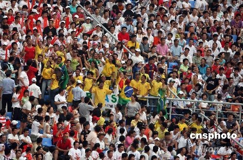 8月10日,北京奧運會沈陽足球分賽場舉行男足預賽,因中國隊、巴西隊分別出戰,場內坐無虛席。中新社發 張宇 攝