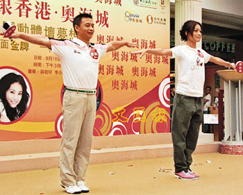 中新網8月11日電 據香港文匯報報道,剛從奧運開幕儀式上傳遞火炬的前體操金牌得主李小雙和為奧運開幕式擔任表演嘉賓的容祖兒,10日雙雙為香港奧海城舉行“一面金牌 一個夢想的實現”主持揭幕儀式。