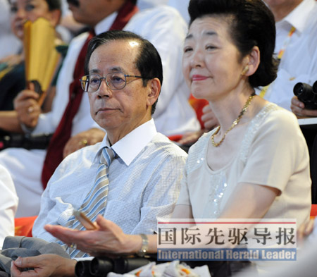 國際先驅(qū)導(dǎo)報特約撰稿吳林發(fā)自北京 8月8日的北京奧運會開幕式上,當(dāng)手持中日兩國國旗的日本奧運代表團進(jìn)場時,坐在元首區(qū)的日本首相福田康夫和夫人福田貴代子隨即起身,向他們揮手致意。