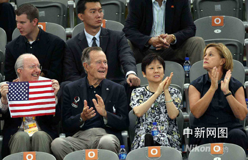 8月12日上午,北京奧運會男子體操團體決賽在國家體育館舉行,中國男隊以預賽第一的成績開始向金牌沖擊。美國前總統布什夫婦在美國駐華大使雷德陪同下前來觀看。中新社記者 任晨鳴 攝