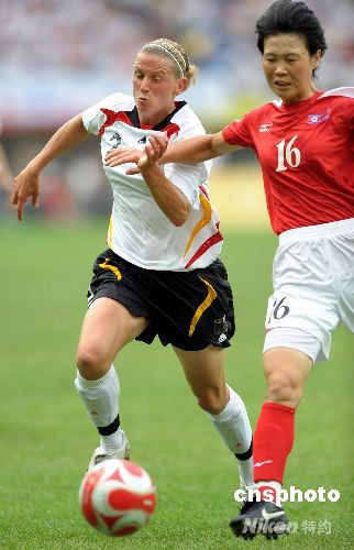 8月12日下午,奧運女足小組賽進行到第三輪,朝鮮女足和德國隊的較量在天津“水滴”體育場進行,亞洲冠軍朝鮮隊和世界冠軍德國之間為出線一決勝負,上半時雙方0:0踢平。圖為德國隊2號克里斯汀.薩特格曼與朝鮮隊16號孔慧玉在拼搶。 中新社發 陳文 攝