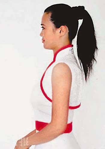 馬尾辮最能體現活力,額頭的部分體現很好的流線型,有一種運動的張力,而馬尾辮的適中發量則能夠體現頭發的動感。馬尾的根部,發型師用假發制作的如意扣收口,如意扣既代表吉祥如意,又能代表中國傳統的民族文化。同時在操作方面,如果頒獎禮儀小姐頭發過短,如意扣也可以幫助掩蓋假發接駁的部分。