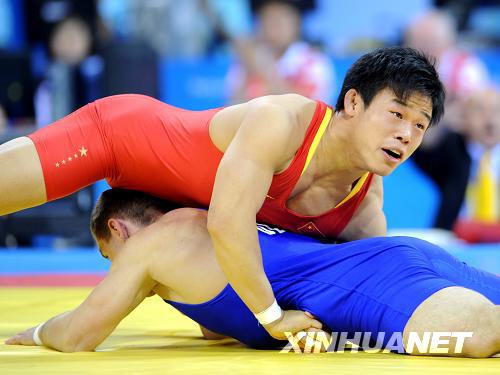 8月13日,常永祥(紅)在比賽中。當日,在北京奧運會男子古典式摔跤74公斤級半決賽中,中國的常永祥戰勝白俄羅斯的奧列格·米哈伊洛維奇,闖入決賽。新華社記者 李鋼 攝