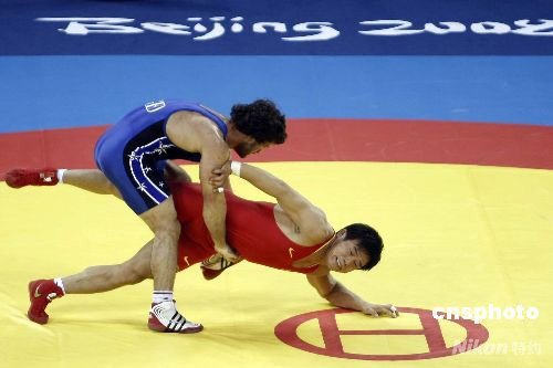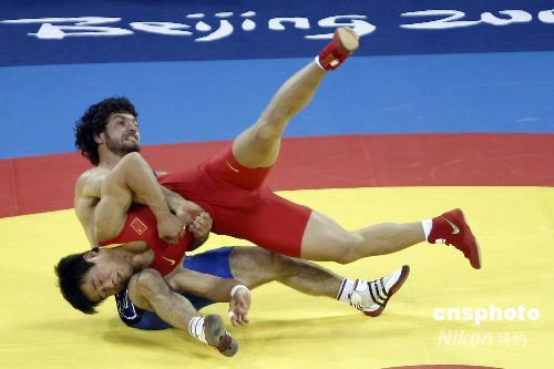 8月13日,北京奧運會摔跤男子古典式74公斤級冠亞軍決賽中,中國選手常永祥(紅)不敵格魯吉亞選手馬努恰爾·克維克利亞,獲得銀牌。這枚銀牌也創造了中國男子摔跤隊在奧運會比賽的最佳成績。 中新社發 盛佳鵬 攝
