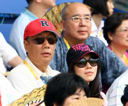 2008北京奧運會棒球賽13日在五棵松體育中心舉行中華臺北隊對荷蘭隊的揭幕戰,鴻海集團董事長郭臺銘(左)和妻子曾馨瑩也到場看球。(上圖)