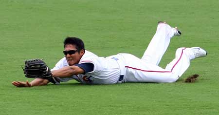 北京奧運棒球賽13日在五棵松體育中心舉行中華臺北隊對荷蘭隊之戰,中華臺北隊選手林哲瑄一個漂亮的接殺,整個人撲倒在地上。(下圖)