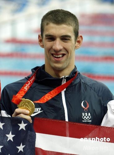 8月17日,美國隊獲得北京奧運會男子4乘100米混合泳接力冠軍,至此,23歲的美國游泳運動員菲爾普斯不僅用8金刷新了單屆奧運會金牌紀錄,而且還將個人所有奧運會的金牌總數提高到了14枚,達成了他人難以超越的“世界紀錄”。中新社發 杜洋 攝