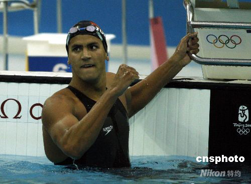 8月17日,北京奧運會男子1500米自由泳決賽中,來自突尼斯的邁盧利擊敗澳大利亞名將哈克特,以14分40秒84獲得金牌。 這是突尼斯從1960年第一次參加奧運會以來獲得的第一枚奧運會游泳金牌。 中新社發 杜洋 攝