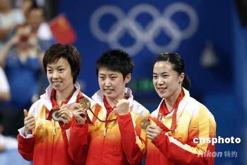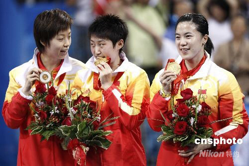 王楠、張怡寧和郭躍領獎臺上品嘗金牌味道。 中新社發 盛佳鵬 攝