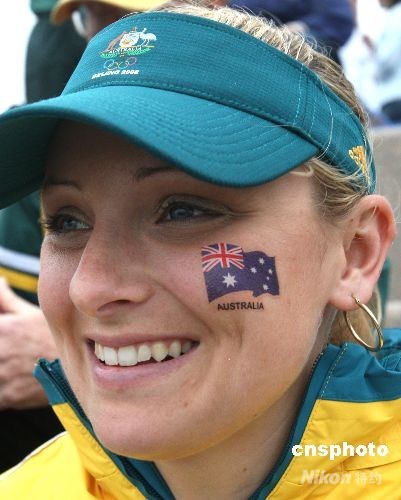 澳大利亞作為一支參賽強隊出擊當日的比賽,澳大利亞美少女精心裝扮,到比賽現場為運動員助威。中新社發 趙振清 攝